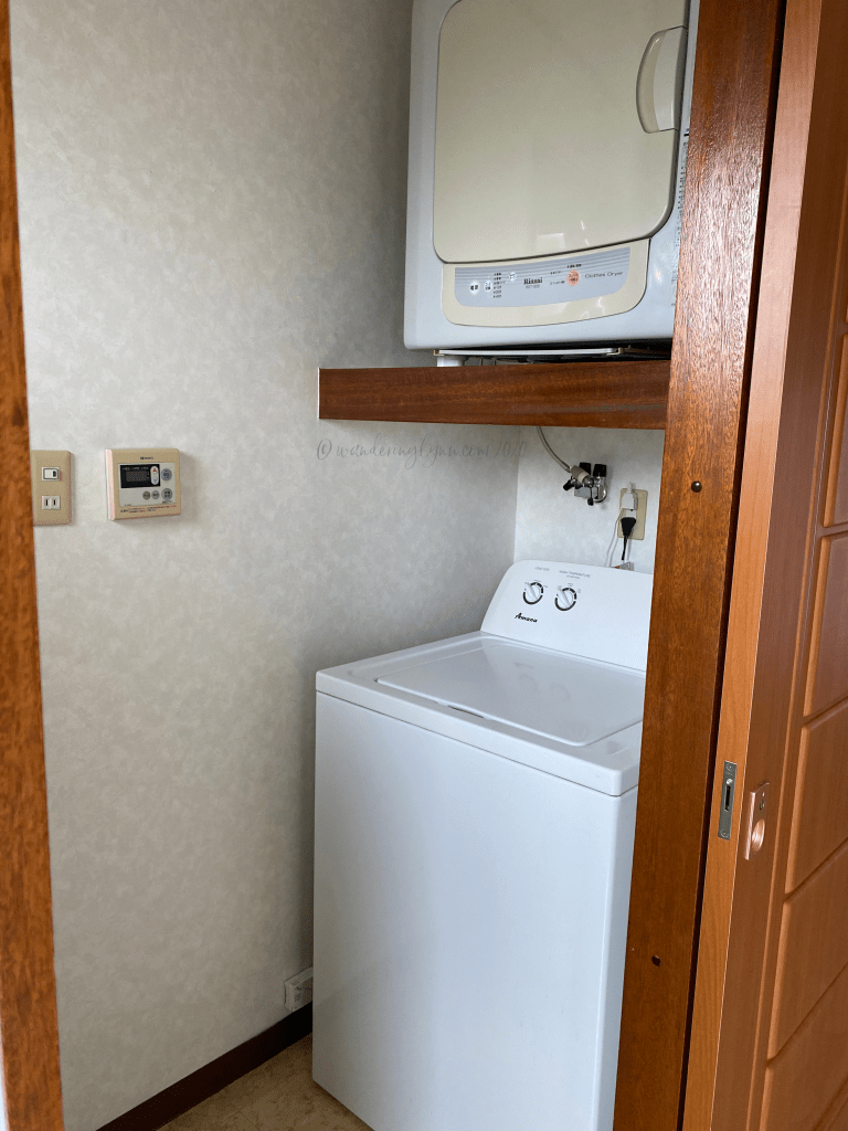 One thing I couldn’t figure out is that the apartment has an American-style stove, fridge, and washing machine, but a Japanese dryer. Why? Who knows. Luckily the leasing agent gave me instructions how to use it since the buttons all have Japanese writing.