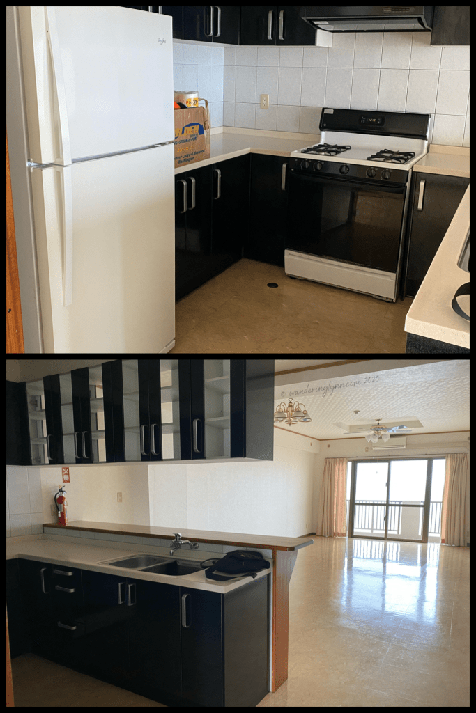 My new apartment is on the 7th floor of an 8 story building with 4 apartments per floor. I only share one wall with number 704. There is about a 3′ gap between me and 702, which is the side the bedrooms are on. I have a tandem parking space that will fit two Okinawan cars and the apartment is approximately 2 km from the closest base gate.