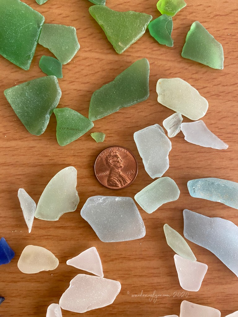The pieces I found aren’t large. The largest one is approximately 2.5″ long and maybe 1″ at its widest point. The colors range from dark brown to white. I found a few teeny cobalt blue pieces, but most were green, white, and brown.