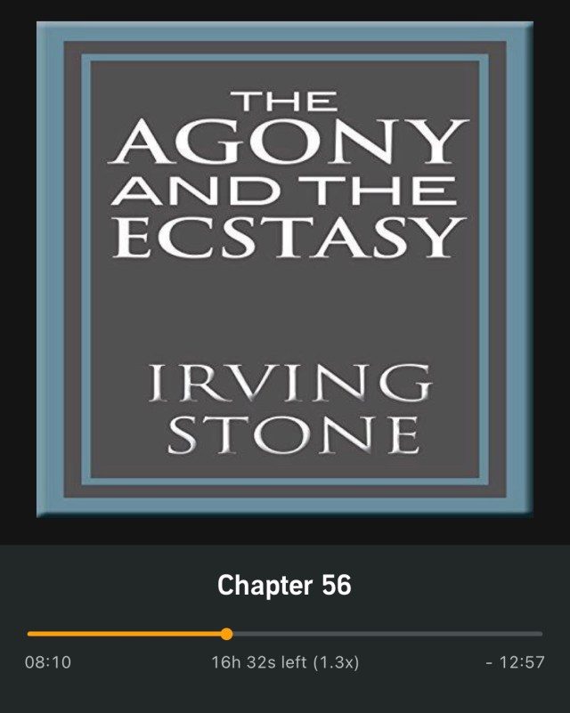 half-way!I’ve also been listening to The Agony and the Ecstasy. It’s been in my audio-queue for a long while. It’s a chunkster (the book is 750+ pages and the audiobook is 33+ hours). So it may take me the rest of the month to finish it!