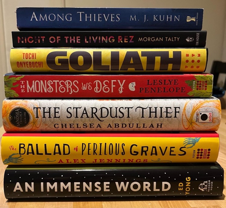After this, I skedaddled back downstairs to get 3 books signed: Night of the Living Rez by Morgan Talty (who’s panel with Tomás Q. Morín conflicted with the Thieves panel), Chelsea Abdullah’s The Stardust Thief, and M.J. Kuhn’s Among Thieves. This, of course, meant I missed Bring on The Blur: Reality vs Fantasy with Kim Fu and Lidia Yuknavitch. <sigh>