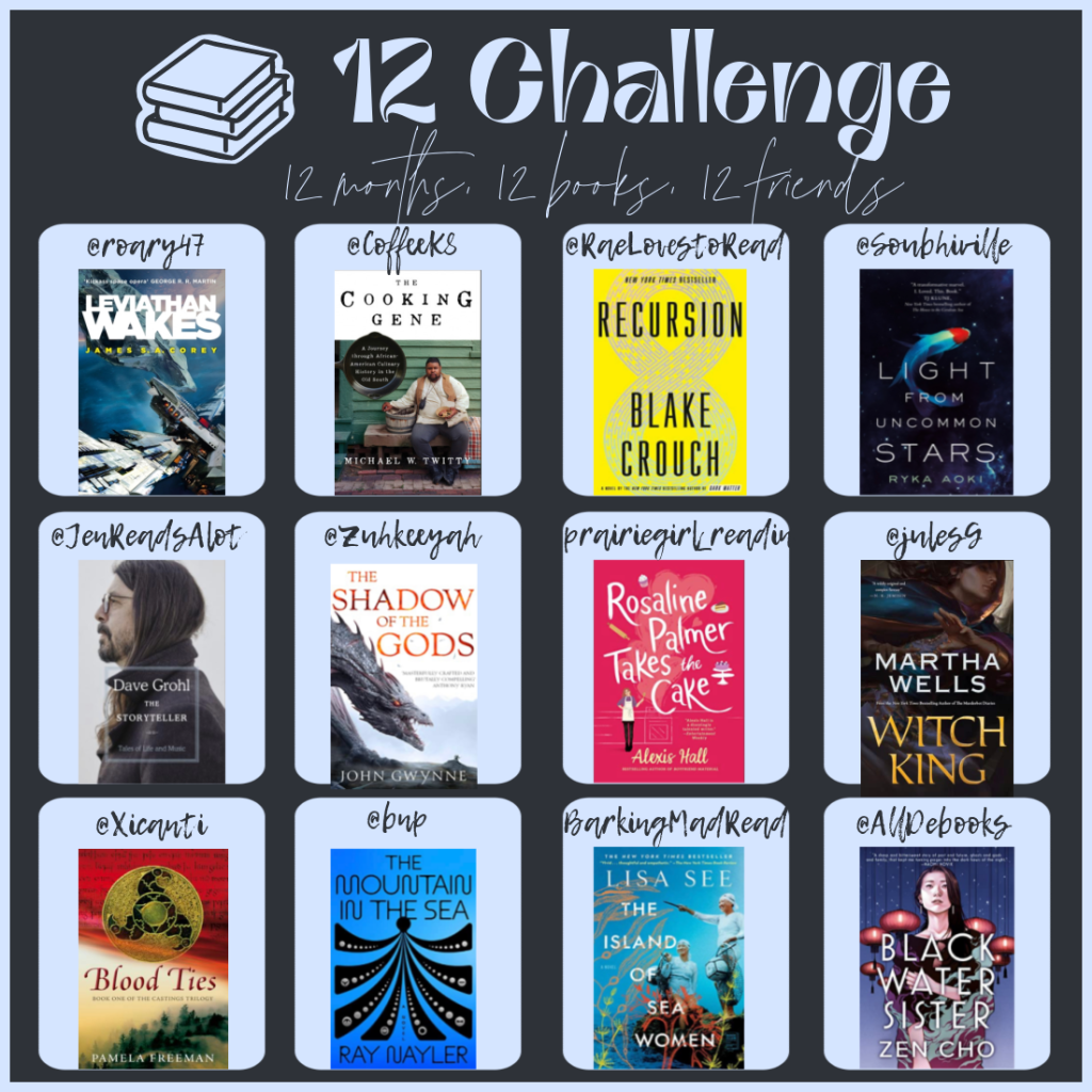 This is a challenge you can find on many a bookstagram or booktok page. The 12 Challenge is 12 months to read 12 books recommended by 12 friends. My 2023 board: