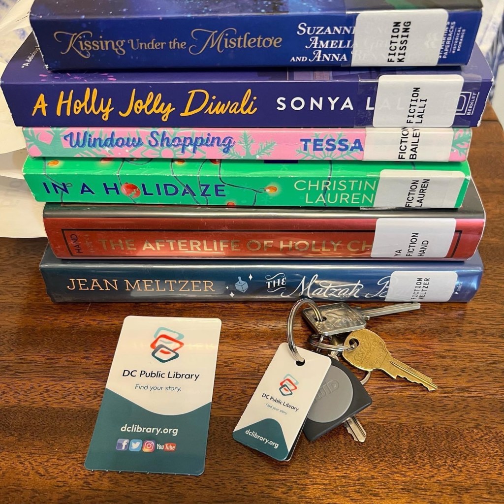 the day I got my physical card, along with a stack of books for a holiday romance reading challengeIf you don’t have a library card, you’re missing out. So go right now and get your library card. Don’t live near a library? Then check out the Libby App, which connects to thousands of libraries. Just get a library card (many libraries have this online) and start checking out e- and audiobooks for free!