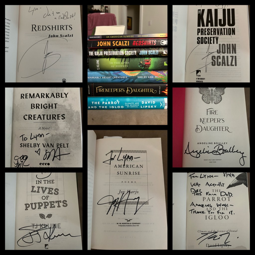 My day involved mostly standing in lines to get my books signed. I met John Scalzi, TJ Klune, Shelby Van Pelt, Joy Harjo, Angeline Boulley, and David Lipsky. (I actually had a great chat with David Lipsky, who is a super nice guy.)
