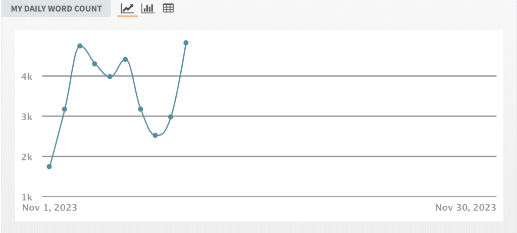 I’m averaging over 3,500 words a day. Three thousand five hundred. I can hardly believe it myself. And every single day, I’ve been well over 1,667 words. November 1 was my lowest day at 1,748 words. Today is my best day at 4,839.