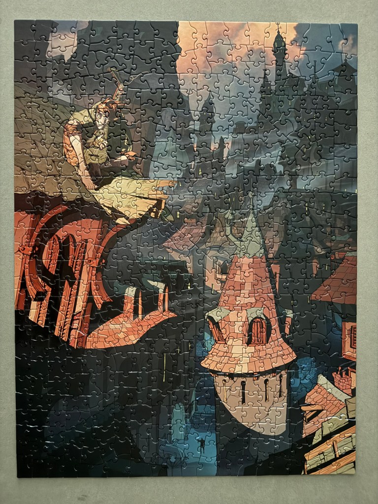 While the quality was average (the pieces dislodged easily), it was still a fun puzzle. Kvothe is on a roof clutching his 4-stringed lute. The box has quotes from the Name of the Wind describing Tarbean. The pieces are slightly larger than average.