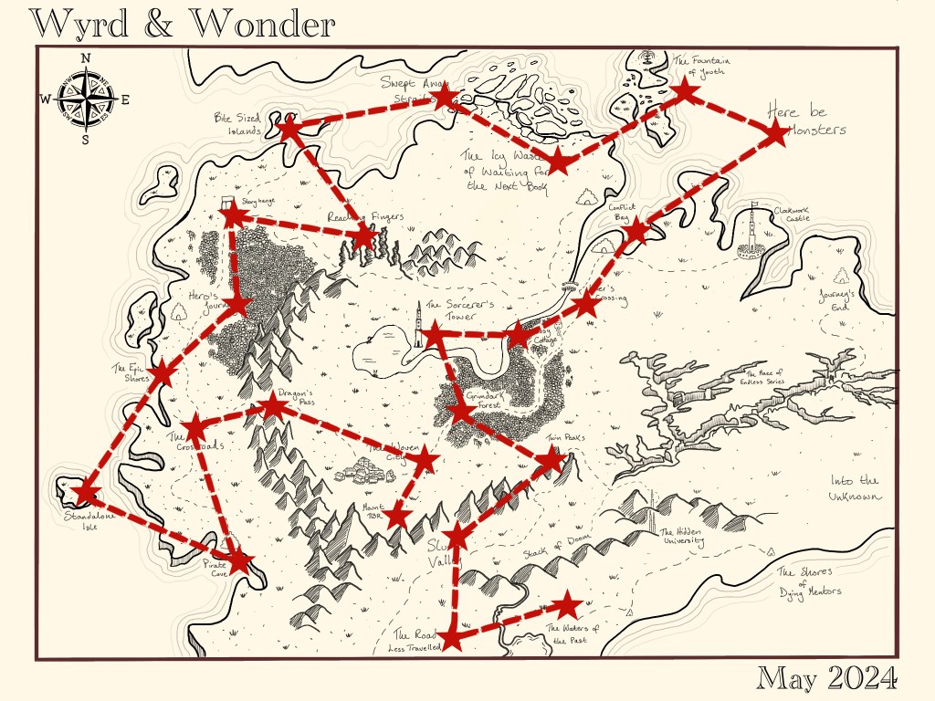 Wyrd & Wonder map by Ariana (IG: @booknookreview) with my journey added in red