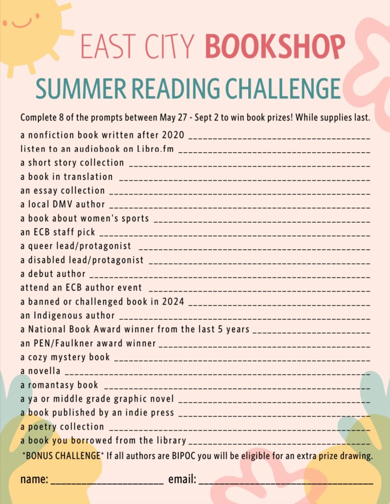 This year, I decided to take up East City Bookshop‘s, one of my local indie bookstores, Summer Reading Challenge. They have both an adult reading challenge and a kid reading challenge.