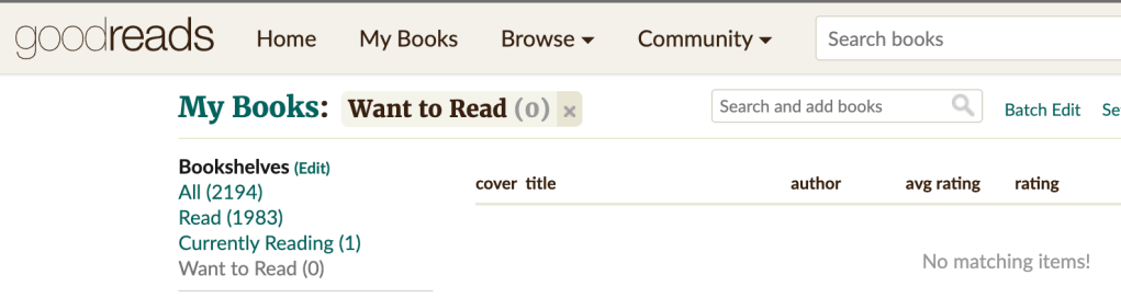 I think I’ll keep my TBR at 0. Or maybe I’ll just add the TBR books I physically own, and the celebrate as I remove each one to the “read” shelf. Then the TBR will go down by 1, which will feel like a reason to celebrate . . .