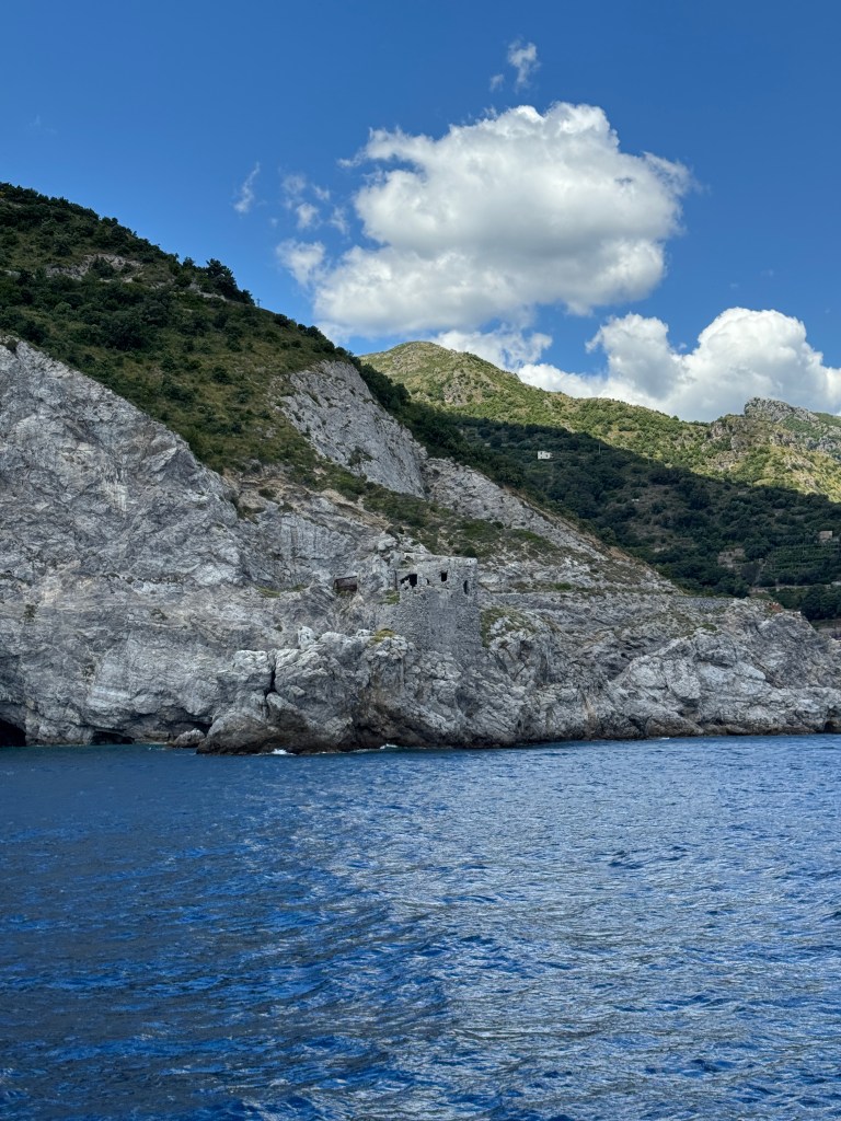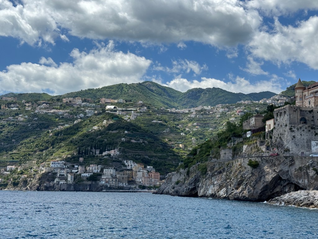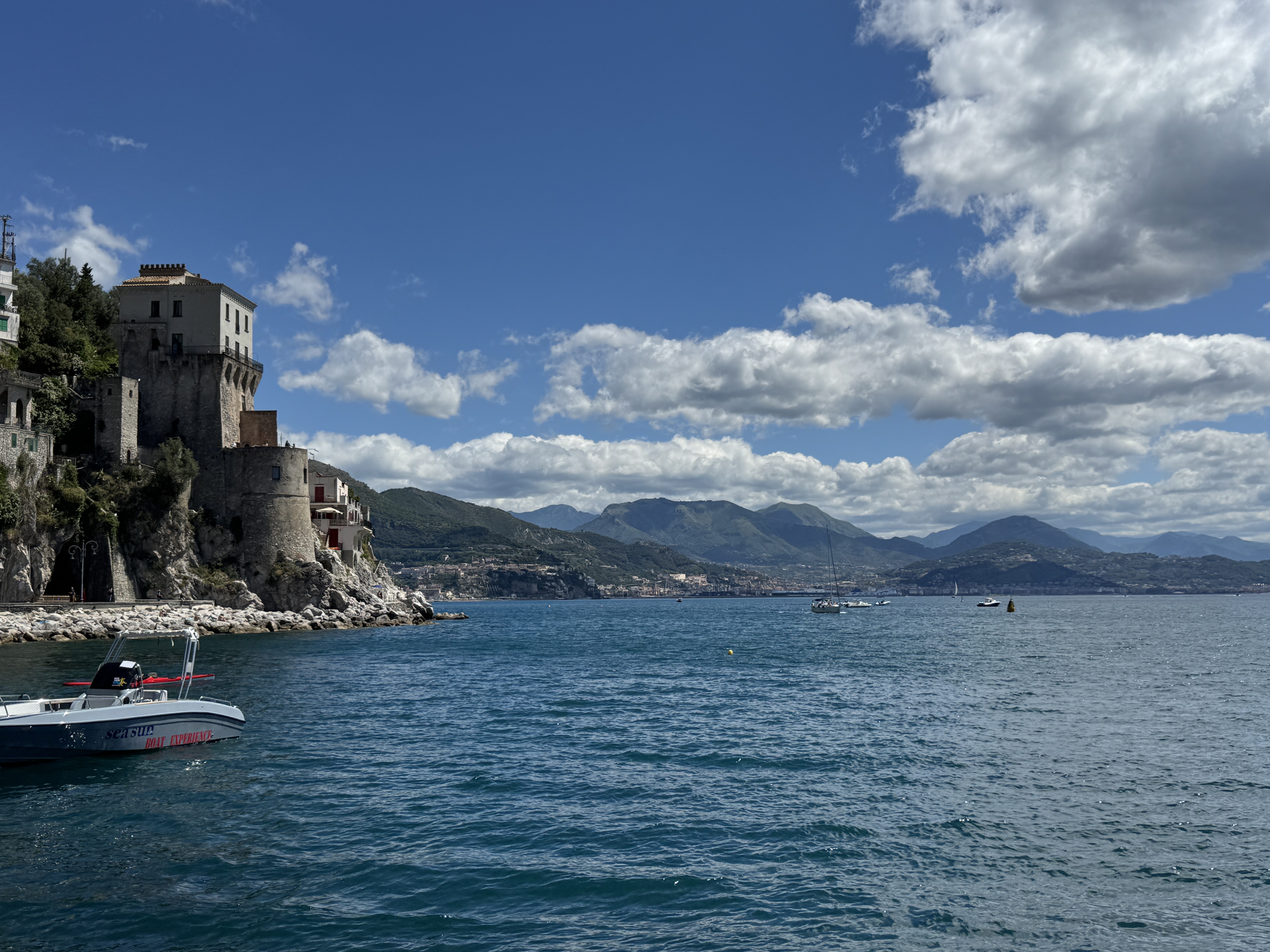 From Cetara, the ferry to Amalfi takes about 40 minutes with stops in Maiori and Minori. The views along the way were absolutely fantastic. Ruins of watchtowers intermingled with the various villages and the windy Amalfi Drive. Various yachts, sailboats, and even a catamaran or two were anchored along the coast and in the coves.