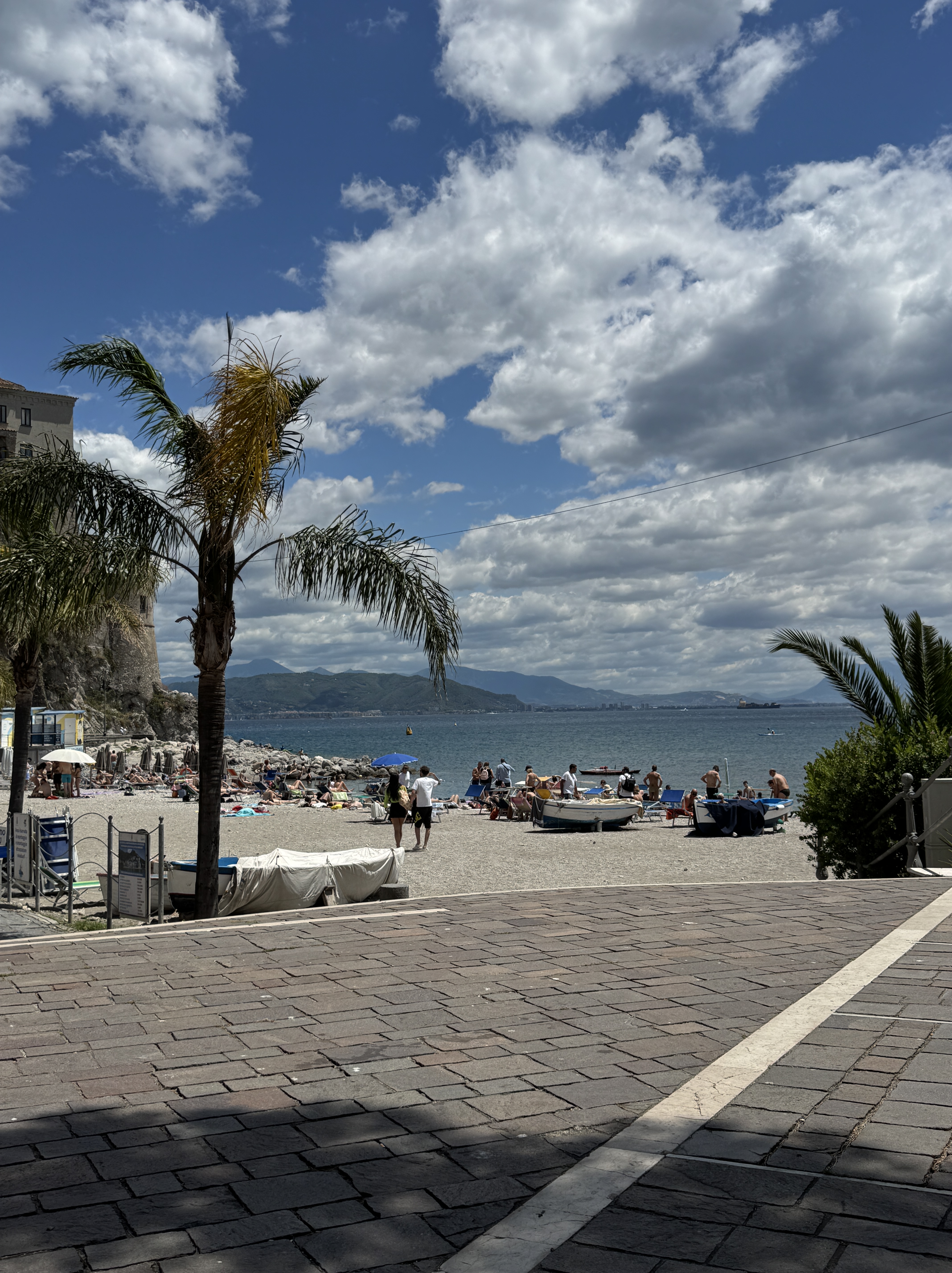 Like many Italian beaches, the beach in Cetara was smallish with more rocks than sand. But people were on the beach enjoying the gorgeous day. It was around 80F (~26C) with clear blue skies.
