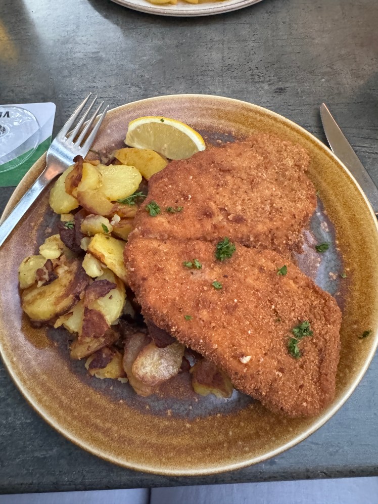 Monday night dinner, I ate at Weinstrube Hottum, where I had a traditional schnitzel with a glass of Rhine Valley white wine. The restaurant seems small, but it had an amazing garden in the back, which is where I sat.