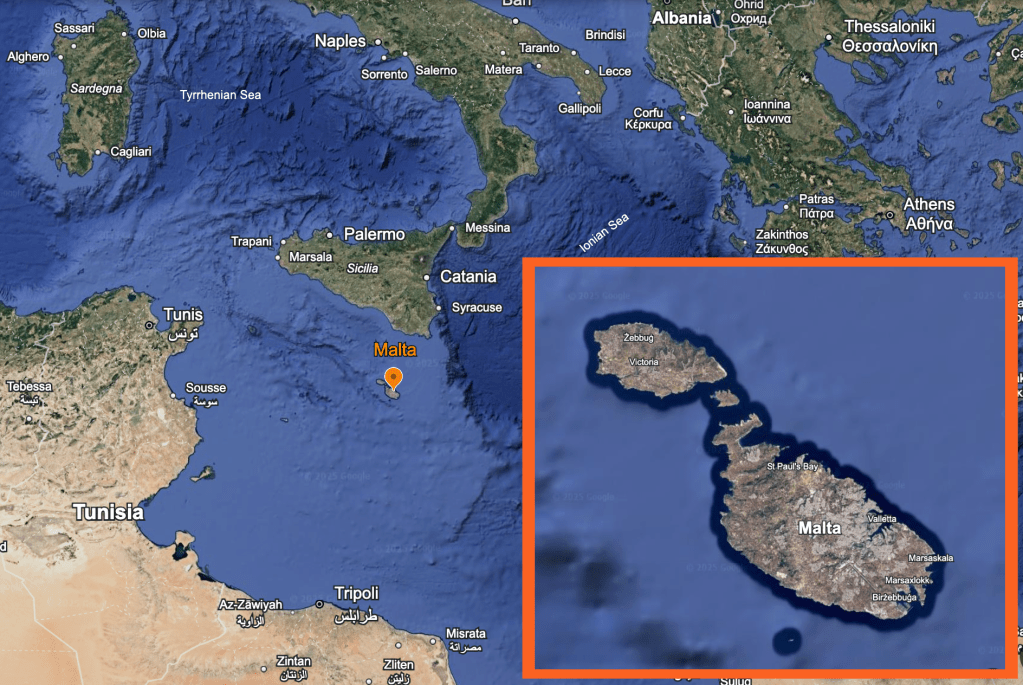 Malta lies approximately 80 km (50 mi) south of Sicily and approximately 280 km (176 mi) from Tunisia on the north African coast. Being so close to Italy, the flight from Naples took only 75 minutes.