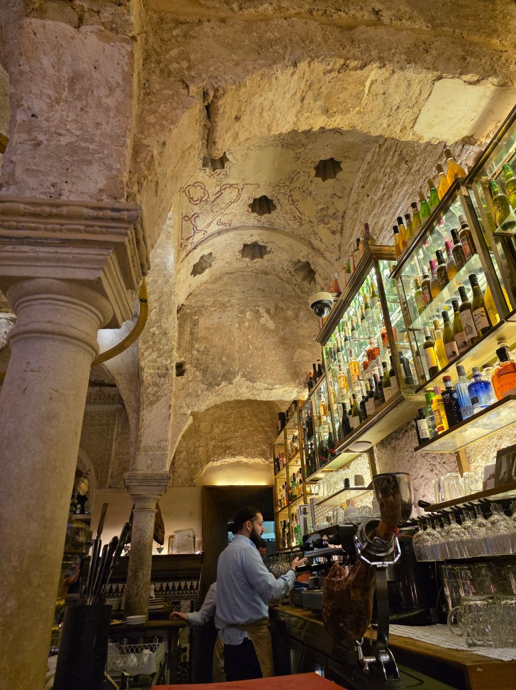 One of the tapas bars we ate at in Seville was Cerveceria Giralda Bar, which is in the remains of a 12th-century hammam (Arab bath). The exposed architecture—the remains of cermaic tiles, the arches, the vents for the steam and water vapor to escape—made it feel like we were eating in a different place and time. Simply incredible (photo in the gallery above).