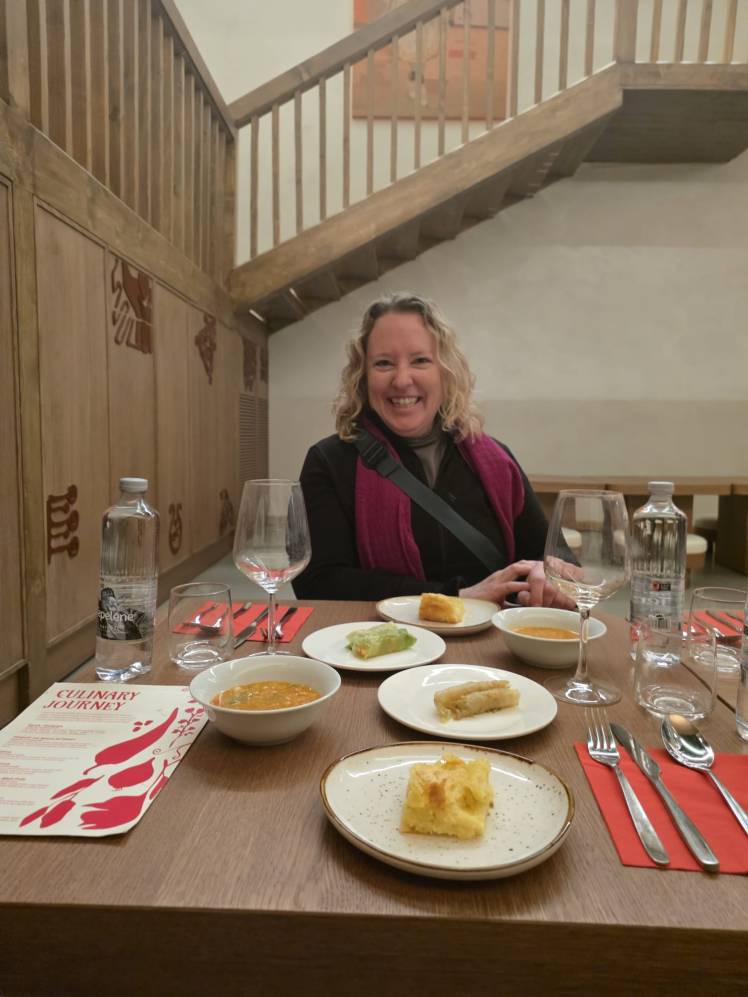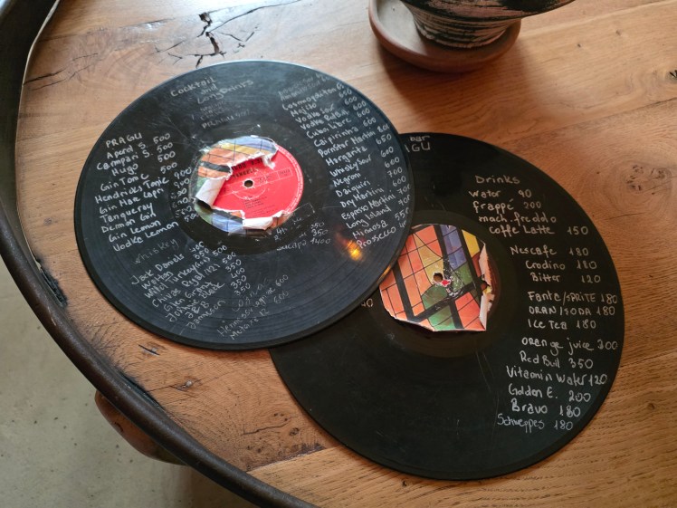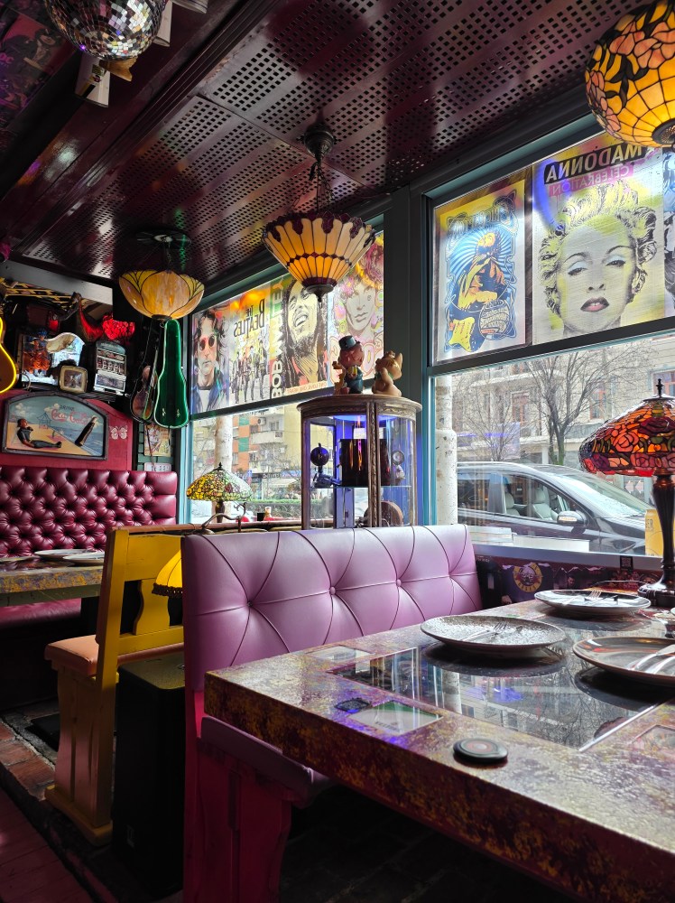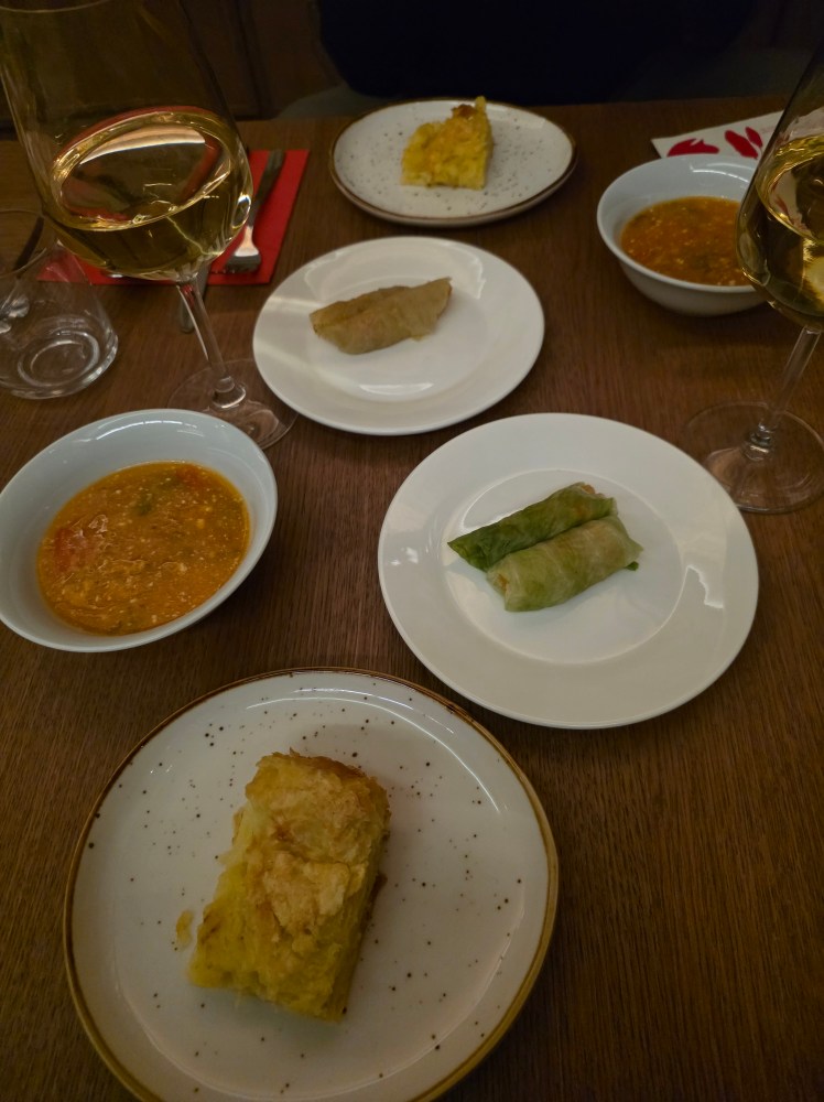 We continued our walk and ended the day with nearly 25,000 steps. We basically saw the same things we had seen on Friday because Tirana, at least the older part where the sights are, isn’t that big. But we stopped along the way for cafes and treats. We stopped at for drinks at Pragu Bar, where the menu is written on old vinyl records. C tried raki, the traditional clear grape-based brandy, which comes in flavors, so of course, he got more than one. I had one of the bar’s craft cocktails. Then we ate dinner another popular restaurant, EOS Mezze Bar, where they serve traditional Albanian food tapas style. So we got to try more delicious traditional food.
