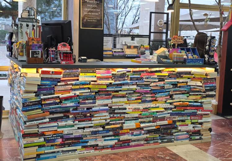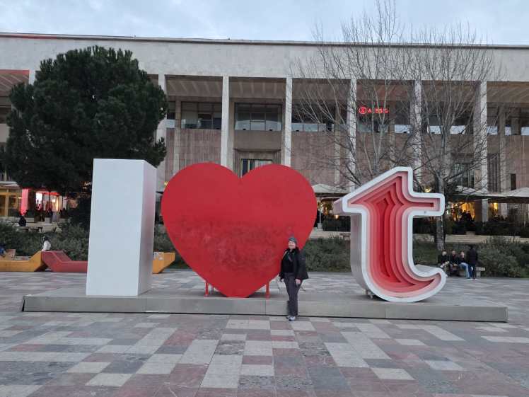 Luckily, the rain stopped right around the time we were finished with lunch, and we headed toward Skanderbeg Square, the main plaza in the centre of the city. It is a huge square surrounded by the National Opera house, the National Library and bookstore (which had English language books too), the Tirana International Hotel, the Palace of Culture, the Bank of Albania, the Ethem Bey Mosque, the Clock Tower, the City Hall, several Ministry buildings, and the National Historical Museum, a statue of their national hero Skanderbeg, and an “I [heart] T” sign.