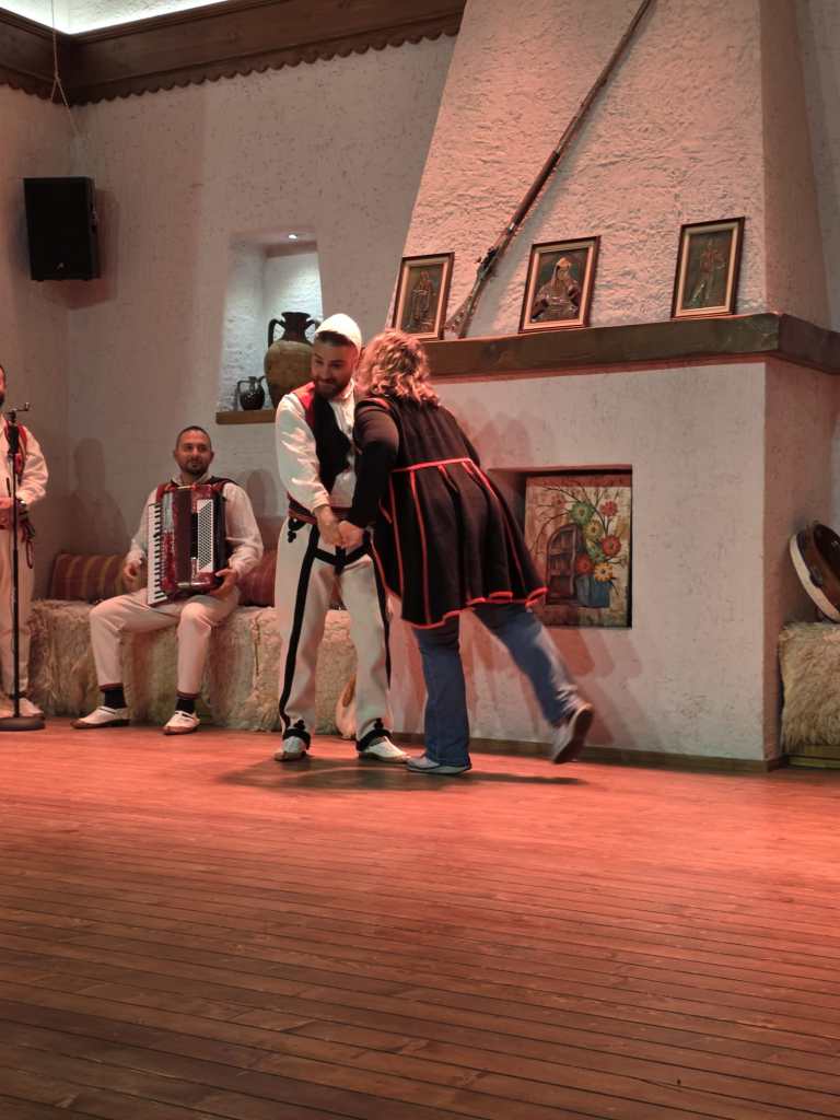 On Friday eventing, C books us a cultural experience—Albania Night, a traditional dance and music show experience that fully immerses participants in local culture. The show is reenacts a wedding, and showcases traditional garb and dancing of both the southern region and the northern region.