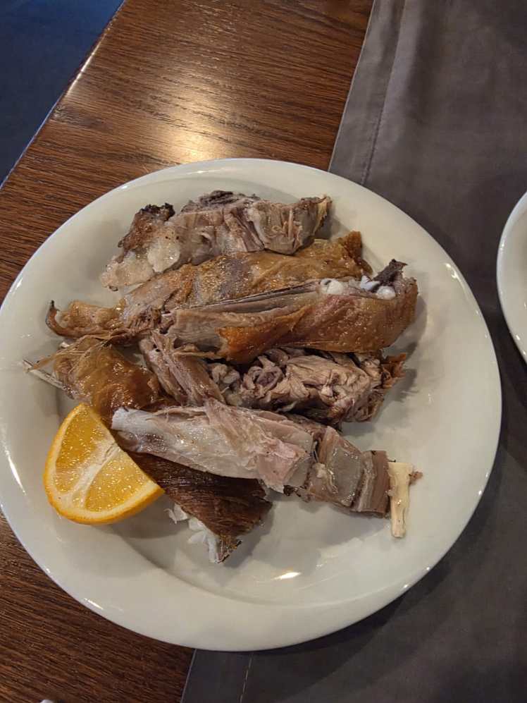 Our division of labor for trips is I find the cheap flights and book the hotel, and C does research on food and restaurants. One of the restaurants for Albania food that C had flagged, Restorant Tepelena, was right around the corner from our hotel. Albania, like many southern European countries, tends to eat later than Americans with lunch between 1:00 and 3:00. But although noon was a little early and the restaurant was nearly empty, we were seated.